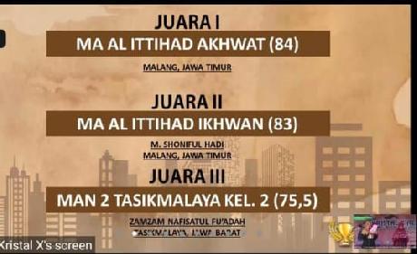 MAN 2 Tasikmalaya News(19/2/2021)--Alhamdulillah MAN 2 Tasikmalaya menjadi juara ke 3 Musabaqoh Syarhil Quran (MSQ) Tingkat Nasional pada acara Kristal X yang diselenggarakan oleh pondok Pesantren Terpadu Al-Multazam yang dimulai pada tanggal 10 Januari-10 Februari 2021 Siswa/i yang meraih prestasi gemilang ini adalah Zamzan Nafisatul Fuadah, Intan Nurotul Jamilah dan...